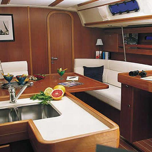 220 V- Landanschluss, Ladegerät, elektrische Bilge- und Druckwasserpumpe, Volt- und Amperemeter, Kompass, Echolot, Logge, Windex, UKW-Seefunk mit DSC, Hafenhandbücher, Seekarten, Navigationsbesteck, Fernglas, Kartenplotter, elektrische Windmessanlage, Autopilot, Rettungsinsel, Rettungsringe und Rettungswesten, Bootsmannsstuhl, Feuerlöscher, Seenotraketen, Nebelhorn, Taschenlampe, Handlenzpumpe, Gasherd mit Backofen, Spülbecken, Kalt- und Warmwasser, Kühlschrank, Pött und Pann, Fender, Festmacher, Bordwerkzeug, Bootshaken, Heizung, Sprayhood, Radsteuerung, Radio/CD,